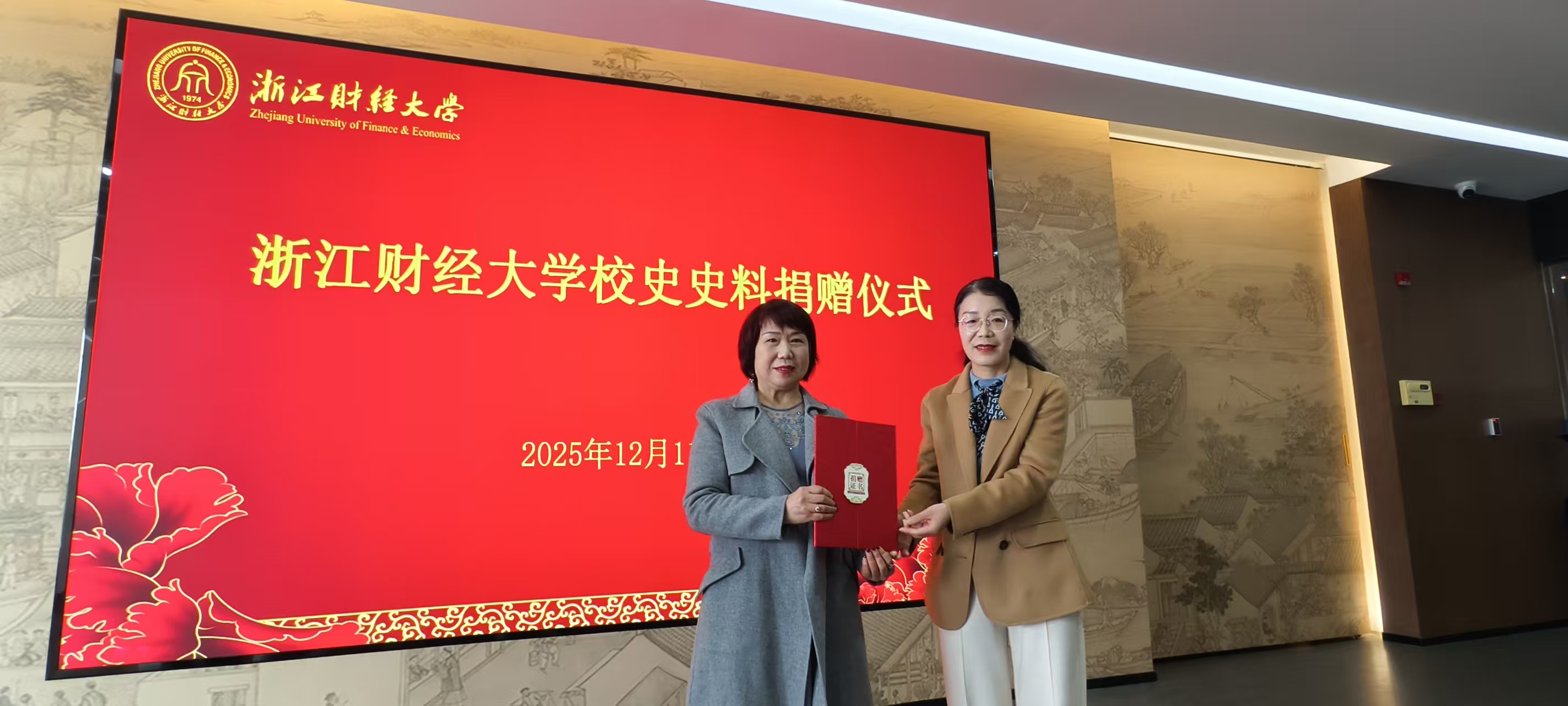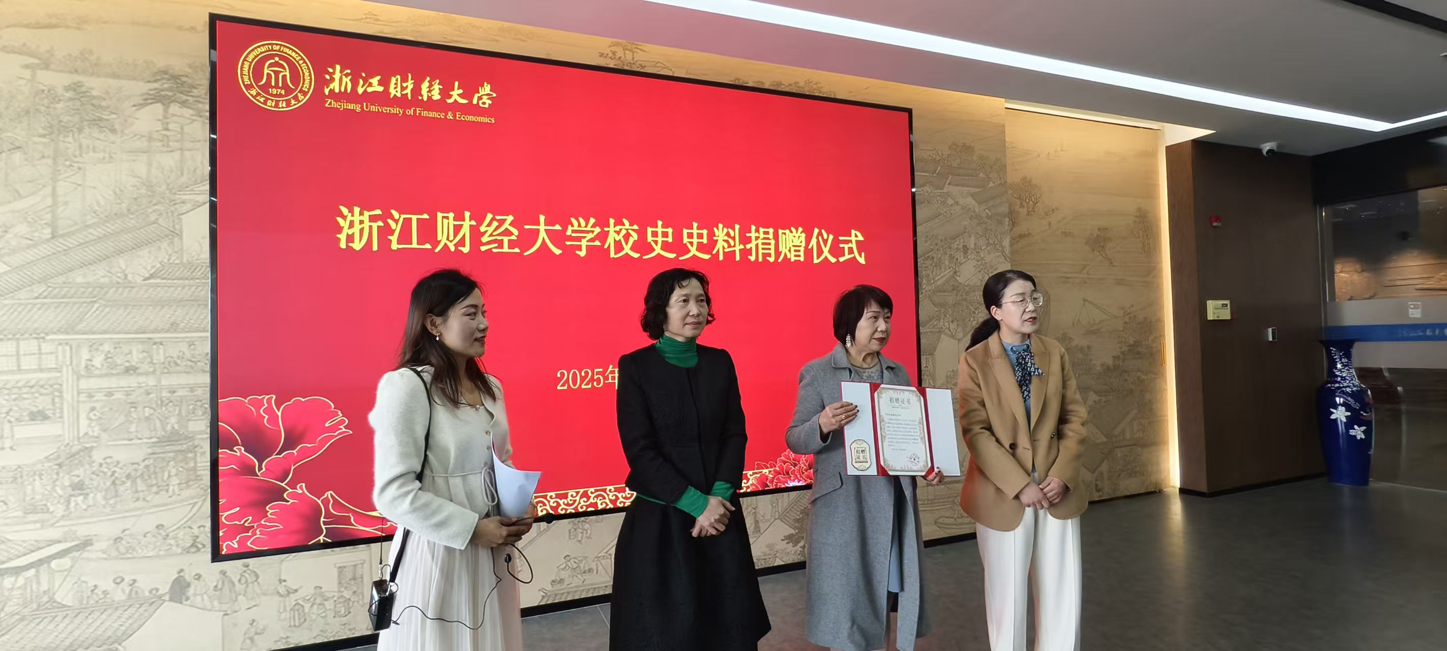 王玉琴馆长向陈朝霞老师颁发捐赠证书,代表学校档案馆、校史馆向陈老师致以崇高谢意,感谢其悉心珍藏并慷慨捐出1996年11月为本科教学评估精心打造的“明天更美好”晚会等系列校园文化活动影像史料,为我校档案馆、校史馆再添无价瑰宝。这批史料不仅以原始录像、照片、手写记录等实物形态定格了“明天更美好”等系列校园文化活动的过程,生动再现了在艰苦创业时期浙财师生饱满的精神风貌与卓越的艺术才华;它们既丰富了档案馆、校史馆馆藏资源,也为师生提供了可触、可感、可追慕的校园文化建设史料,实现从物质保存到精神接续的立体传承。陈老师不仅是浙财历史的参与者、见证者、记录者,更是以满腔热忱投身育人的实践者。