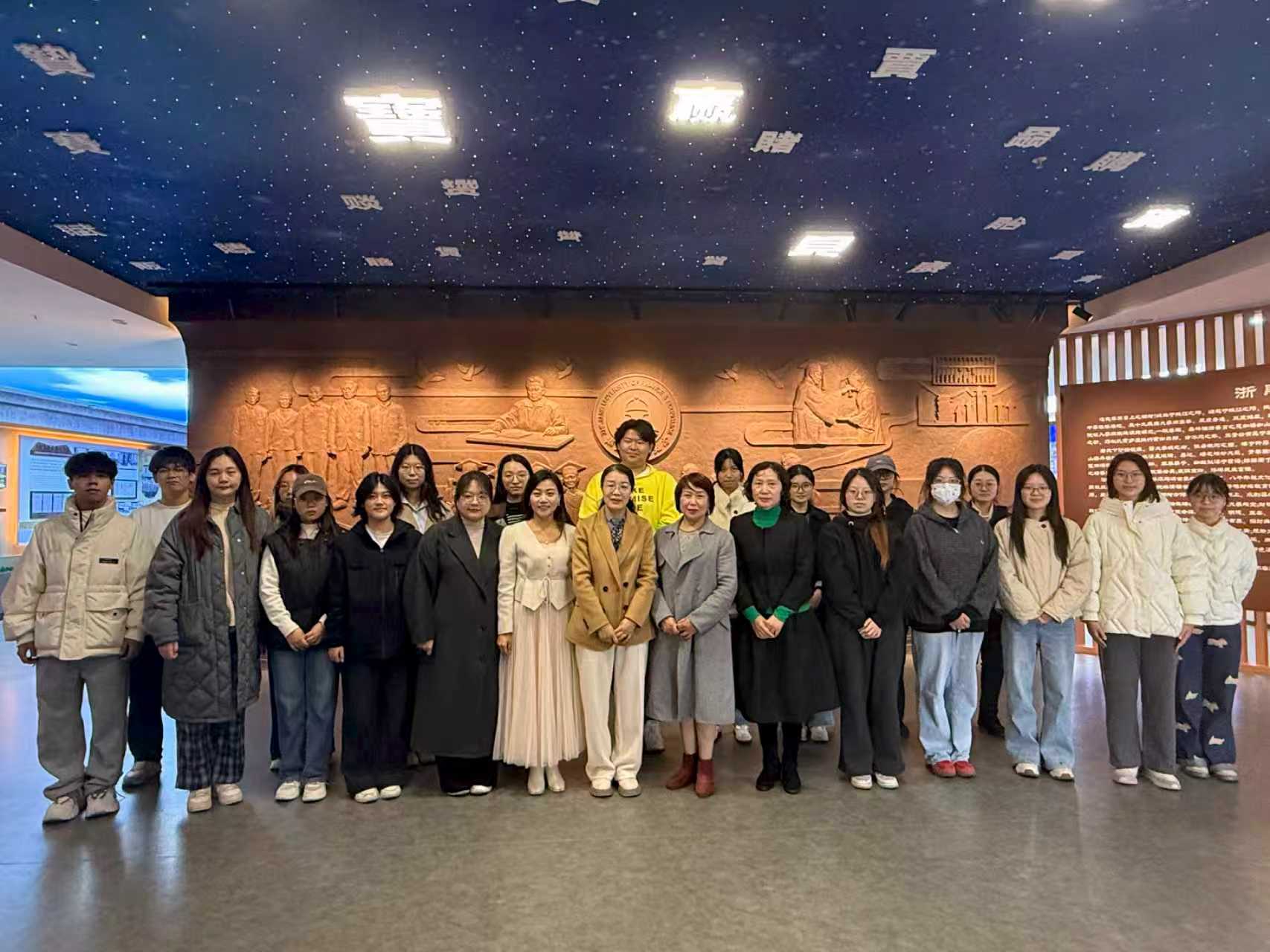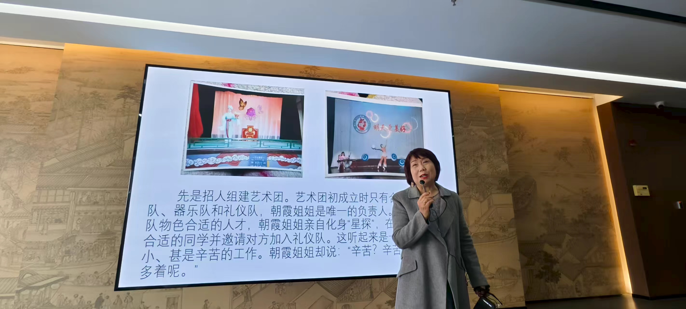 陈朝霞老师对在场师生讲述了学校公共艺术的创建与发展,自1994年入校以来,作为公共艺术教育的拓荒者与校艺术团的创始人,亲历并推动了学校美育事业的蓬勃发展。她为现场师生上了一堂融汇校史、美育与情怀的生动“思政课”,最后,陈老师以一曲《掌声响起来》把全场氛围推向沸点。掌声一次次为她响起,也为所有把青春写进校史的人响起。她以30余年的坚守诠释着校史不是玻璃柜里静默的影像,而是“明德笃学、抱朴守真、崇实创新、经世济民”的浙财精神在血脉里的持续跳动;更是把崇实创新的笔触写在浙财校园里的情怀。